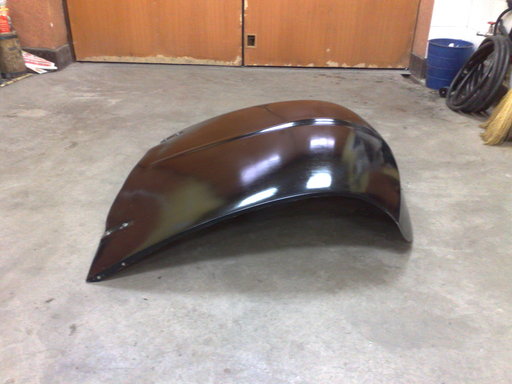 Днес взех предният капак и му монтирах желязната рамка ,за да не промени формата си.Пробих отворите за емблемата.,пантите и заключването на капака към купето. Понеже е отлят в понеделник и технологично му трябва определено време за да придобие цялата си якост.Според мен е станал много добре.