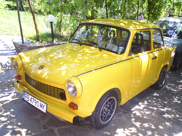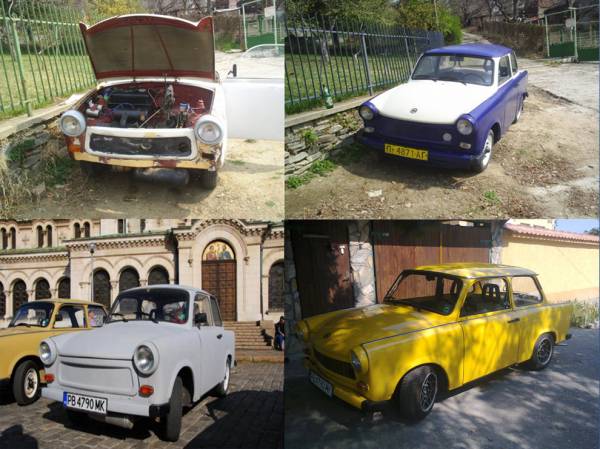 Преди време си изтрих нацяло темата, защото беше доста разпокъсана и дълга. А всичко съм го правил поне по два пъти, като всеки втори път по-добре от предишния. Тъй като се разкарвам със стикер на форума на задния прозорец реших да си направя наново темата. Общо взето всичко съм обяснявал как съм го направил по различни теми във форума. Ако ви интересува нещо, стига да е нещо конкретно как съм го направил ще обясня. Историята: Машината я наследих преди много години. Не се движеше, не спираше, дори бутането и беше трудно. Като я взех последно беше карана преди 10 години. Някакъв удър е имало отпред вляво и беше нескопосано оправен. Което пък аз от своя страна оправях на два пъти. Боядисвана 90-те с мече в бяло. По-късно аз я боядисах наново с мече синя, после я подготвих с шприц, който пък не беше подходящ. 2010-та до 2011 го карах, след което ме издразни как изглежда и го вкарах за две години за тотална подготовка и пребоядисване навсякъде. Вече го подготвих както трябва. Всички калници и тавана са презалепени като повечето и сменени. Всички панели освен тавана са презалепяни два пъти, тъй като първия път ги лепих със силикон  . За тия две години подготовка на купето смених и окачването. Нови спирачки на 4-те колелета с 4х100 междуболтово, нови втулки и т.н. Окачването вмомента е свалено от оригинала с 40 мм отзад и 60 отпред. Класическото 40/60. Може и още, но няма как да се прибера в нас Подсилване на пода с две греди, които са продължение на лапите на магарето. Тогава и изчистих коша. Само с него се занимавах година, понеже беше доста крив в лявата страна от удъра в миналото. И него съм го боядисвал безброй пъти и съм свалял слоеве боя с горещ въздух и нож сума ти време. Откакто се занимавам с тази кола са ми помагали много хора от форума с части и съвети, които не искам да изброявам, понеже със сигурност ще пропусна някой. Те си знаят кои са. Не, че е завършен напълно Трабса, но става за показване. Вмомента машината си е в движение и е ред на тапицерията, защото не прилича на нищо. Подготвил съм му един Баркасов двигател, който и той седи от 2 години с нужните части за монтирането, но и той ще почака още Ето и снимките: