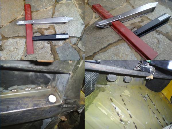 За това мицубиши не намирам да има ел. водна помпа. Направих си нови носачи + 2 см, че предните бяха къси и наклона на колелата беше грешен. Това за мен е по-сигурния и лесен вариант от играта с правенето на нови колена за долната втулка на шенкела. Заварено е отдолу и отгоре + 2 мм подсилваща ламарина по целия носач от долна страна. Носачи и магаре след пясък.    Спрямо оригинала: