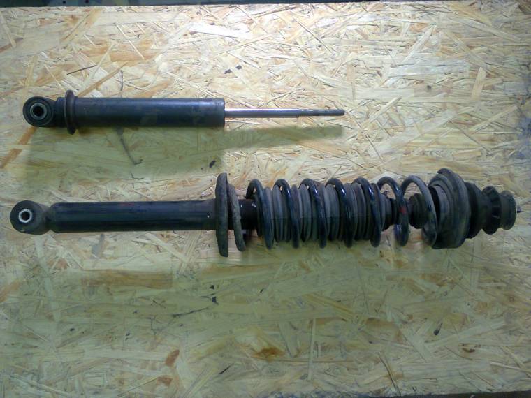 Нещо ме прихвана и реших да ви запозная с какво се занимавам напоследък. Тъй като имам сериозен проблем със задните амортисьори, които при моя Трабс са с пружини, реших да си сглобя нещо ново. Проблемите са, че ми опира вътрешния ръб на джантата в пружината при някакви по-сериозни натоварвания от сорта на двама човека освен мен в колата  , защото отзад имам чашки на носачите и като са ми по-широки джантите опират. Варианта да изнасям джантата навън с фланци не му харесва. Неприятна работа, причинена от широките джанти. Реших че ми трябва по-тясна пружина и по-твърд амортисьор, а защо не и по-къс, хем да снижа малко задницата. И така си се чудех какво да взема и един ден забелязах на един познат на Фолксвагена правилните пружини, а те са от Polo 6N. И на следващия ден си взех направо два задни амортисьора от моргата.Които м/у другото са същите като и на някакъв Сеат, ама забравих какъв. Реших да използвам от VW пружината без да я режа и горната и долна капачки, а от трабантовия Горната капачка и амортисьора. От VW може и да ползвам и горните гумени тампони за да заменя алуминиевия конус в трабантовите. Долната със съвсем лека корекция влиза в трабантовия амортисьор и застава на мястото на старата. Горната трябва да се направи отвор в средата и също влиза в трабантовата горна капачка ( която е една запушена тръба с дупка ). А може и да стане варианта да не се ползва трабантовата горна част, ами нещата от Полото това трябва да го видя. Мисля си и да направя от долната страна регулиране на натягането на пружината, както при коиловъри. Чудя се с какви да заменя трабовите амортисьори - ладови, те хем са по-къси. Ама на тях ще трябва да се заварява в долната част чашка да държи нятяга на пружината а това дали ще прецака амортисьора ? ето снимки, следва продължение