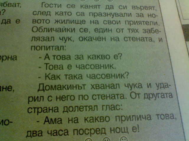 На вечеря с баща ми пак правихме състезание за най-шумна пръдня. Победи кучето. Беше толкова силно, че уплашените съседи с викове «Руснаците идват!» се скриха в мазето. Уговаряхме ги да излязат чак до тъмно. Добре че накрая се сетих да им кажа, че утре в най-близкия супермаркет има разпродажба и ще могат да си купят електрически пъпочистачки с 10 процента по-евтино от обичайното. Веднага изскочиха...