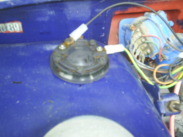 Плюса за уреда взех от бобината, така че като е на контакт и като работи двигателя да отчита уреда. Сигнала се взима от поплавъка, а масата от моторчето за чистачки - на него вляво има отредено място, където да пъхнеш кабелната обувка. Точно до кафявата жичка - маса на разходомера.