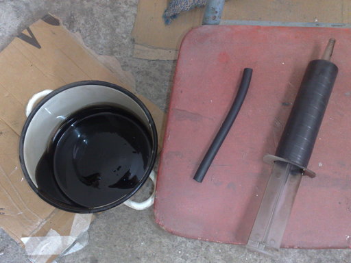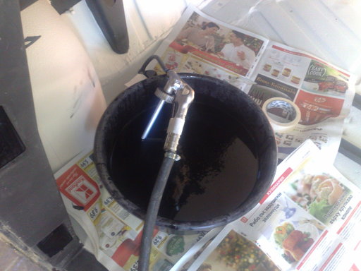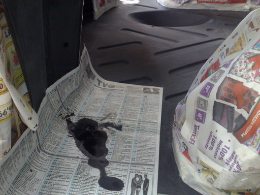 Днес реших да пробвам едно пълнене на задната греда с отработено масло .Купих си гумено фи 10 и запуших отворите в гредата от долу.Започнах да наливам отработено масло със спринцовка през единия от двата отвора от горе.След като маслото се показа от другия отвор залепих хартиено тиксо и започнах да дигам с крика от другата страна и наливам масло докато се напълни максимално.Разклатих купето и източих маслото. Явно заварките,грунда и шагрето са запушили всички други отвори,защото от долу остана чисто. Ето и снимките: