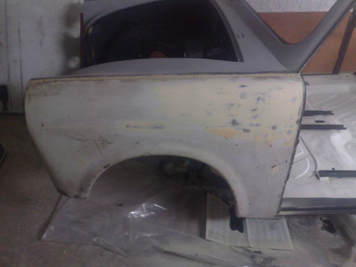 Здравейте колеги,смених мръсния найлон с друг и реших да сложа временни колела за да е по мобилен трабанта. От една седмица чета по немски,чешки и други сайтове за цветовете на трабанта през годините и така и не намерих името на моя цвят и затова реших да го правя по цветовете които са по дуропласта .Моят трабант е бледо жълт с тъмно жълти ленти.Основният цвят ще бъде пак жълт и то максимално същият,но лентите,гривните на фаровете,стоповете,осветлението на задния номер,предна и задна броня ще бъдат сиви,какъвто е и цвета на част от тапицерията,а и последно са били сиви.Ако някой знае нещо за жълтия цвят нека пише,а ето и малко снимки.