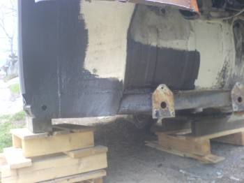 Ето докъде съм стигнал : Предната дясна част от трабанта вече е почти готова. Дясната половина от предната греда на купето е изрязана и сменена с нова ламарина . Остава лявата, която съм я почнал . Калниците от вътрешна страна след двата слоя миниум ги намазах със сива алкидна боя и после с Боди 930 . Вътре половината под е готов . Реших да сваля магарето, защото ми пречеше да правя предната греда( не успях да го наклоня на една страна трабанта и го правя на земята), а и планката за задния тампон не можех да изправя в това положение. Казах си, че така и така съм свалил двигател и кутия, 6 болта остават и магарето слиза