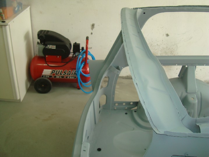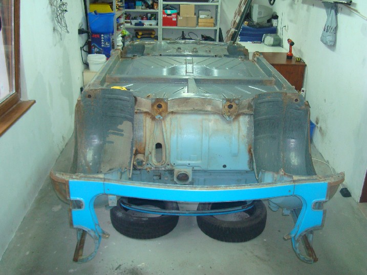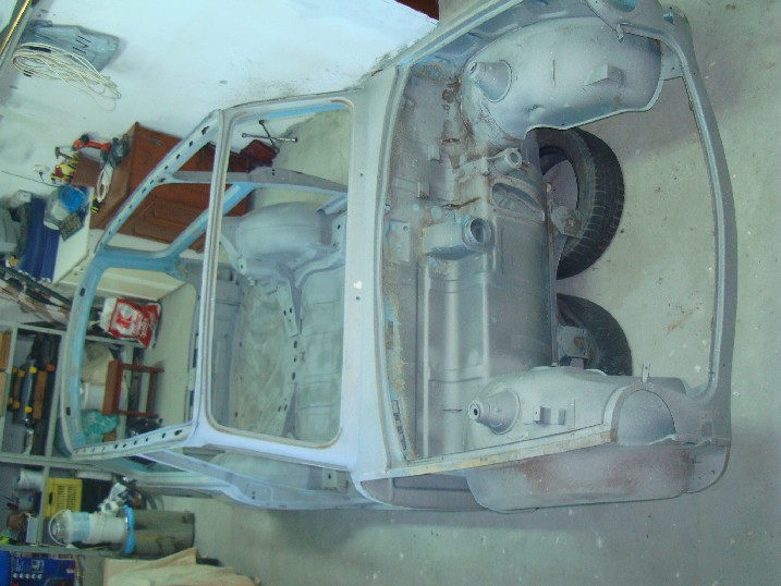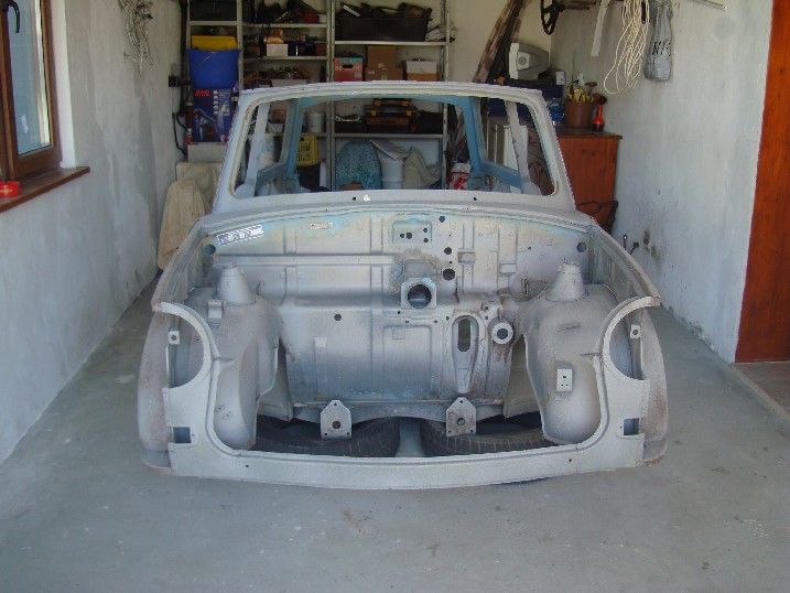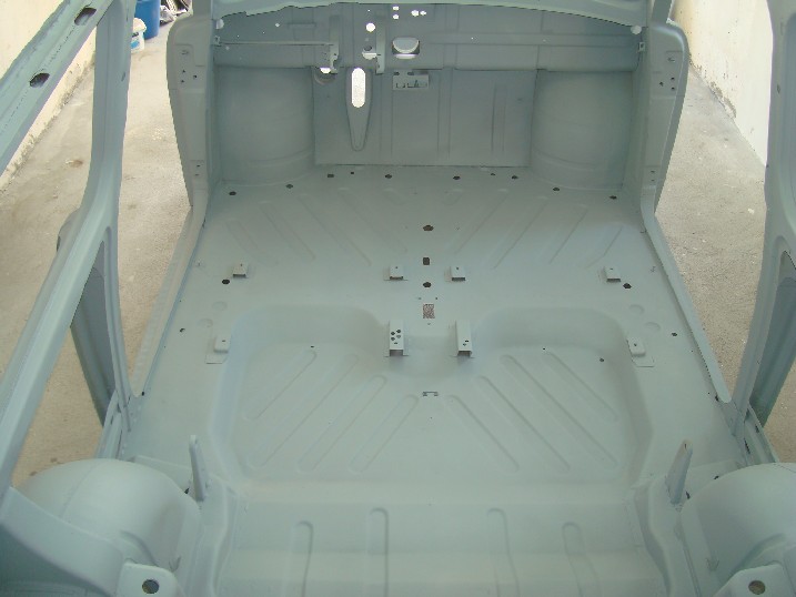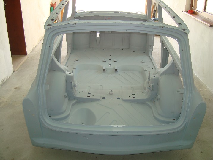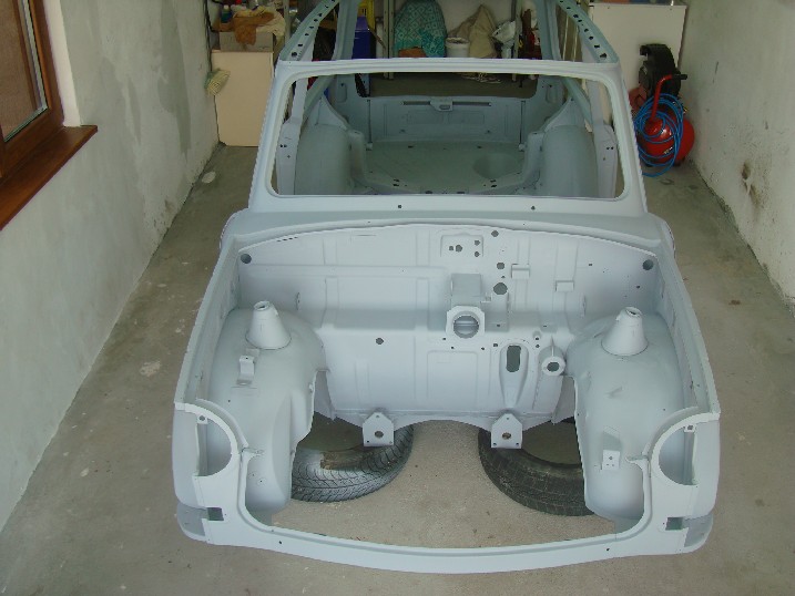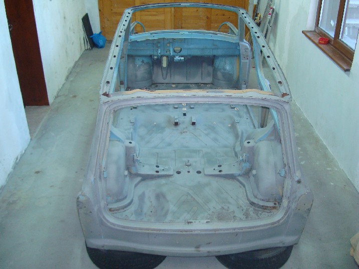 Да ви се похваля! От неделя металната конструкция на трабито доби нов вид, но не без помощта на Вълето, с който грамотно отстранихме с СО-то и ъглошлайфите абсолютно всички пробойни по скелета, цъфнали след песъкоструйката. И с кръпките мисля, че се справихме блестящо, нищо че ни отне много повече от заплануваното време. След зачистването на заварките дори успяхме да нанесем и първата ръка акрилен грунд и то след като съм минал всички ръжди с преобразувател за целта. Сега мога да отдъхна, че съм направил важна стъпка напред. Ето какво според мен предстои да свърша в близко време. 1. Да запечатам дъното с шагрен 2. Да мина с кит навсякъде където личат заварки и кръпки 3. Да мина всички фуги с полиуретан PU-50, освен ако някой не ми даде друг съвет 4. Да обработя отвътре праговете с каквото трябва - дайте идеи! 5. Да мина втора ръка грунд и едва след това да се захвана с врати, кори, таван, капак...