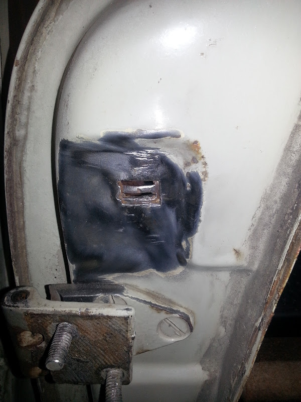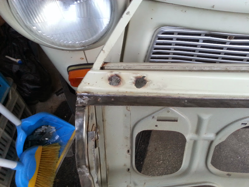 Ето каква я свърших вчера. Извинявам се за качеството на някой снимки, но на телефона ми му падаше батерията и за това отказа да си използва светкавицата 1. Заварих си последиците от премахването на затегналия отграничител.   Получи се, сякаш не е заварявано там. Даже и кит няма да му трябва според мен. 2. Изчистих вратата с бензин за да премахна всякакви отлагания и боклуци, които са се събирали по нея с годините.  3. Махнах остатъците от лепилото и нитовете по дуропластовата част. От долу дуропласта е пукнат, с малко епоксидна смола и марли ще го оправим. 4. Запуших двете дупки, на вратата, които някой беше пробил за да слага огледало, от които съответно влизаше и вода.   5. Запуших и дупките на двете страници на вратата, останали от нитенето.    Някой беше нацелил да нарави дупка баш през точковата заварка. Между двете ламарини имаше няколко милиметра фука. Пристегнах я леко да прибере и я капнах.    6. Изпилих всички заварки, резултата се получи много добре.           7. Направих тестово полагане на дуропласта, като целта беше да не се получава едно огъване от пред долу, което се получаваше преди. Също така гледах как ляга спрямо ламарините на вратата. На места имаше фуга, и се наложи да поизправям ламарината. 8. В горната си част вратата имаше малко огънато. И него го изправих. Нямам снимки, защото се бяха получили много разфокосирани. 9. Реших, че така и така съм почнал да я правя, поне да я направя като хората, и във следващите 10 години да не я отварям, пък и бърза работа нямам. Окачих я на две куки.  и забърках една смеска  , на която този път и нацелих консистенцията ( може да се дължи и на това, че и оловния миниум е нов, този с който преди това работих не се знаеше от коя година преди христа е )  Минах на-всякъде където беше необходимо.      10. И от към купето минах с оловен миниум.  Сега ще го оставя да си посъхне малко - около седмица. После грунд и подготовка за боя.