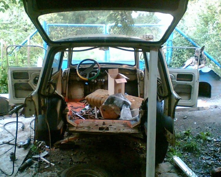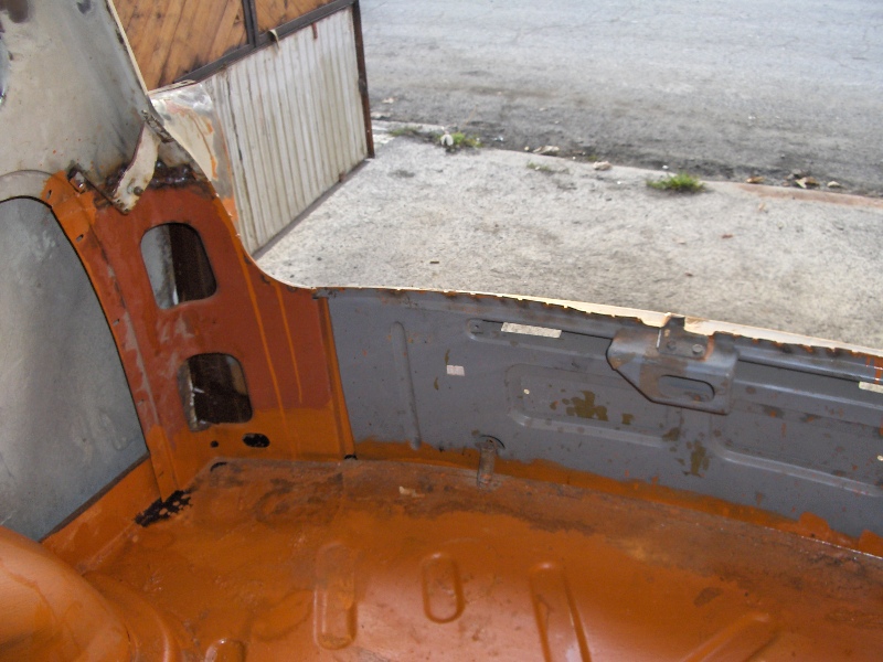 Междувременно върнах Росинант пред блока и цяло лято махах с телена четка остатъци от старото покритие по купето и там където е заварявано, мазане с оловен миниум на наколко слоя (това оранжевото на снимките), включително и вътре в прагове и всевъзможни кухини; мазане със специален корабен лак по поръчка от химическия завод (ще се сетя по нататък за името, намира се в близост до стария път за летището) и ето че времето се развали, намерих му гараж и продължих с чегъртането.