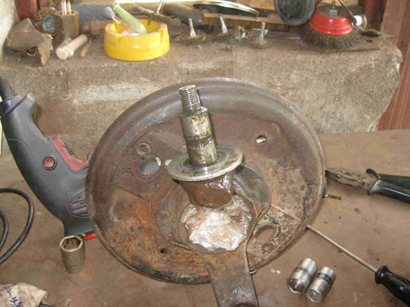 Дойде време най-сетне да се превърна от постоянен наблюдател на форума в по-активен участник. И така историята е следната: Първата ми кола в живота в далечната 1993 година беше Трабант 601 S-много мечтана,невъзможно от магазина и разбира се втора ръка. Машинката беше доста изтормозена, 6 волтова и ми създаваше доста проблеми,но това не помрачи любовта ми към марката,просто го отдадох на лош късмет и липса на какъвто и да е опит. Разделих се с нея след около 9 месеца, трябваше ми по-голяма кола. Вирусът обаче остана. И така допреди година и половина. При навършването на поредния ми юбилей,съпругата ми удовлетвори мечтата ми и ми подари Трабант комби,произведен 1989 година. За комби си мечтаех още от времето на първия ми Трабант. А и цвета на новата придобивка съвпадаше с мечтата от онова време-зелен. По различни причини през тази година и половина нямах много физическа възможност да се занимавам с колата,но сега съм се заел сериозно и ми се иска в най-скоро време да я подкарам. Първото,което трябваше да направя и ремонтът на спирачната система.Колата беше стояла доста време без да се кара и естествено спирачните цилиндри бяха клеясали. Смених гумичките, но спирачната помпа се оказа ,че не функционира. Сменях и гумичките,но така и не тръгна. Купих помпа втора употреба и всичко си дойде на мястото. Започна внимателно опознаване на колата на пътя,разбира се на много къси разстояния. При тези пътувания усетих едно блъскане в предницата. Повдигнах предните колела и се оказа,че втулките на шенкелите са разбити. И ето това е истинското начало на техническо запознаване с колата и самостоятелен ремонт. Започвайки разглобяването смятах,че ще разглобя предното окачване, ще подменя износените части и ще събера всичко отново. Да но не се получи така. Голямата ми изненада беше,че от лявата и дясната страна шенкелите бяха комплектовани по различен начин. Поразрових се из литературата, имам каталог за резервните части на Трабант, но оттам объркването стана още по-голямо. Каталогът ми е стар и със сигурност в конструкцията се внесени доста изменения до производството на моя автомобил. И така!Ще се опитам да качвам снимки на първоначалното състояние на предното окачване и ще съм ви благодарен, ако коментирате това,което виждате и ми помагате с информация! Вижда се,че има разлика във вида и броя на елементите.