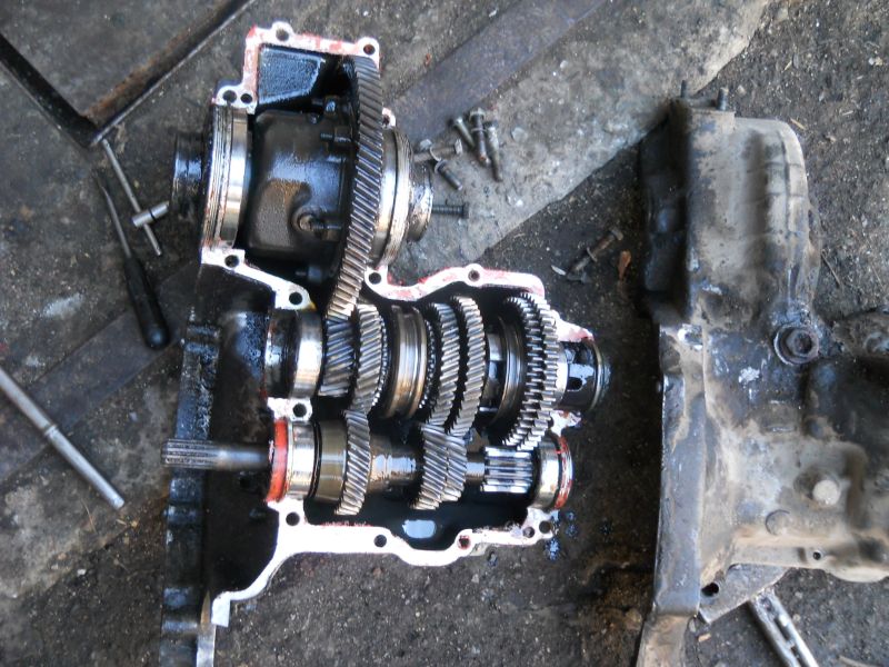 Колега,ако ти се налага да отваряш скоростната кутия,най-напред трябва да свалиш двигателя.Сваля се и дясната полуоска,като внимаваш да не се разпаднат игличките на вътрешното каре!Лявата полуоска си остава на място и тук внимавай за игличките!Аз поставям картон под скоростите.После събирането на вътр.каре е доста"сръткава"работа.Сега,когато двигателя го няма-отвиваш болта с гайка/8мм. с кл.13/ на бастуна/скоростния лост/и го махаш на цяло.Разтваряш леко ушето/прореза/ с отверка за да може да изтеглиш отвътре бастуна през спиците на волана.Не е лошо да бележиш къде е бил бастуна и как е завъртян/на какъв ъгъл/за да си дойде при сглобяването пак на място и скоростите да си включват нормално при събирането.А сега отвиваш гайките на предния и задния /към купето/тампони и жилото на километража.Повдигаш скоростите да излезат от гнездата на рамата шпилките на двата тампона и после ги издърпваш на ляво.Последователността на разгл.е следната:-Сваляш двете телени зегерки с отверка на лагера и го отстраняваш,избиваш шплента на вилката с дорник,като я завърташ леко на една страна и я подваждаш.Развиваш 4-те болтчета 6мм.на алуминиевата капачка и я махаш/излиза1-на ламарина навита на спирала с нея.Има стрелка сочеща нагоре/трябва да я спазваш при събирането/.Тънкостта след като си развил всички болтове на кутията/оставяш я на изкл.положение-т.е.да не е на скорост/да внимаваш при отварянето на двата картера да не вкл.на скорост,че после при сглобяването вилките/2бр./може да ти се разместят и да не можеш да сглобиш кутията!Избиваш внимателно горния картер и след това можеш с почукване отстрани да извадиш първичния вал/този с опашката към двигателя/Там е и 4-та предавка най-открая и въпросния"свободен ход",който при теб може би е заварен!Намира се под "курубата" образно казано.Виж,него за да смениш ти трябва преса/не с чук/и човек който го е правил-не подценявам техническите ти възможности,но се иска опит и "майсторлък",не се обиждай!По-лесния вариянт е друг първичен вал с работеща четвърта скорост.Вадиш твоя и слагаш другия,затваряш,проверяваш дали се вкл.всички скорости и качваш скоростната кутия!Успех ти желая!Сглобяването е по-обратния ред!Ето и малко снимков материал: