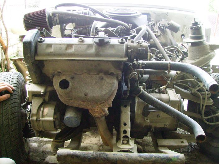 Веднага след като се сдобихме с частите, започнахме да разглобяваме колата. Първо извадихме двгиателя и скоростите и ги разделихме, а после установихме с изненада, че моя маховик не може да побере другия съединител и се наложи да го сменим с този който взехме от Голфа (който съвсем случайно се оказа и с 5оо грама по лек :roll: ). След като сменихме маховика и съединителя зацепихме и скоростната кутия към двигателя - пасна идеално. След това започнахме да мислим захващанията на кутията. Първо преместихме задното ухо малко наляво тъй като голфовата къса полуоска беше с малко по къса от моята. После преправихме и задния тампон на скоростната кутия (просто го усилихме и добавихме 2 планки) за да успеем да го захванем за новата кутия. Следващото преустройство беше добавянето на още една напречна греда на рамата за която захванахме предната лапа на скоростите. Последното захващане, което преправихме, беше това от дясната страна (преместихме го малко назад и надолу). Така монтиран двигателя обаче беше с малко по голям наклон напред, но не установихме проблеми при работата му в това положение. След тези промени дойде ред и на полуоските. Тъй като шлиците им са малко по къси от тези на Вартбурга и болтовете не успяваха да излязат извън главините се наложи да заварим по една къса шпилка (просто отрязахме частта с резбата на два болта за задни главини). Накрая дойде и най голямото преправяне, поради което едва ли не бяхме анатемосани от всички учители в нашата гимназия (и двамата с този приятел учим в Професионална Гимназия по Транспорт и Енергетика "Хенри Форд"). То се наложи поради това, че дългата Голфова полуоска е с няколко сантиметра по дълга от Вартбурговата и се наложи да бъде отрязана скъсена и заварена (тук трябва да отбележа че всичко беше направено доста технически грамотно - отрязахме я на струг след което я усилихме с тръба отвътре и след като я заварихме изчистихме заварките).