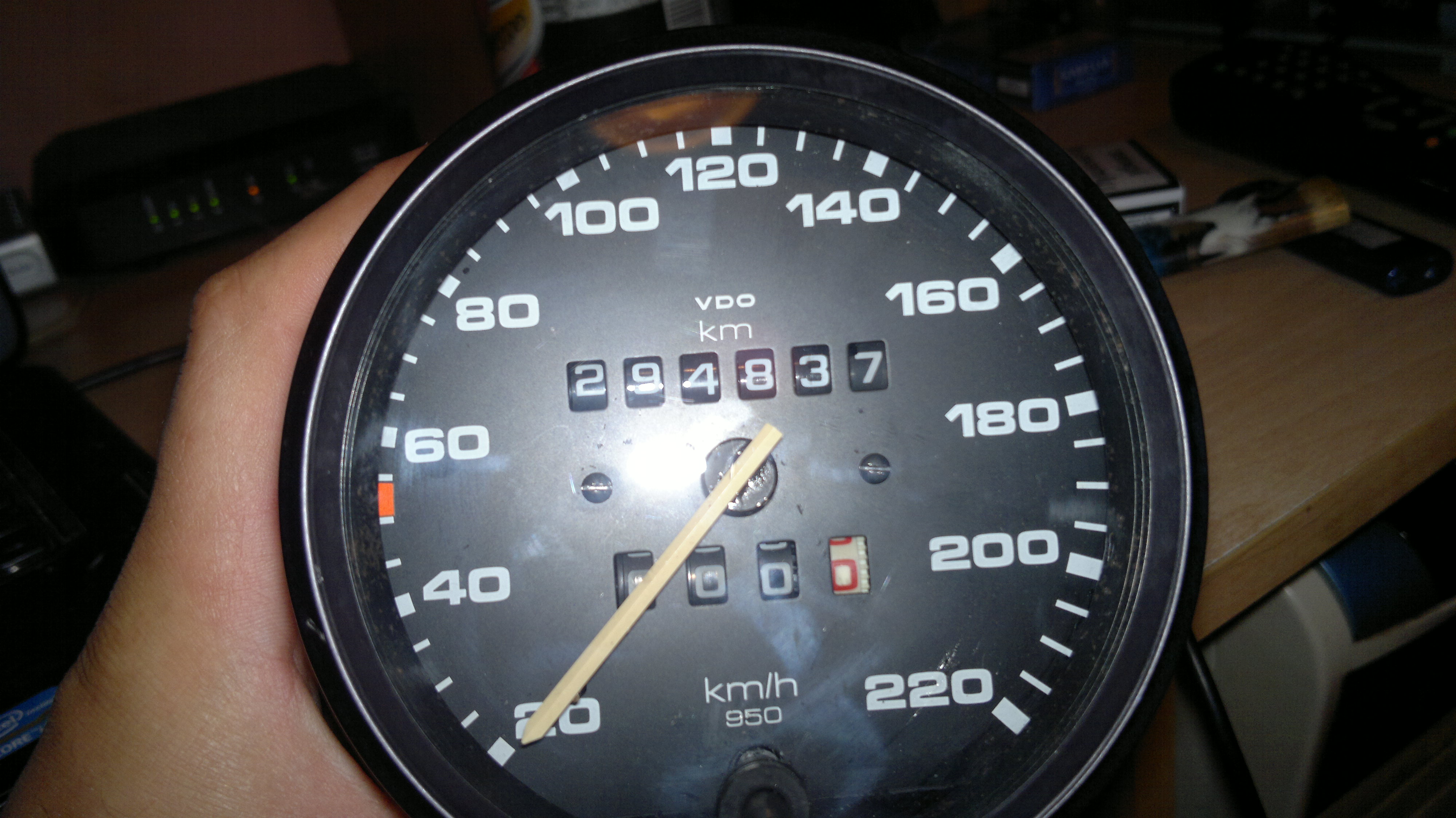 Е колеги, вероятно някои от вас също години наред са се дразнили на малоцифрения вартбургов километраж разграфен едва до 150(като дори последната чертичка е уговорка - според масовата публика е до 140), това са смешни скорости които се подминават дори с читав оригинален двигател, да не говорим че самото разположение на циферблата създава стрес и дискомфорт у водача при положение на стрелката над 100км/ч - нарочно направено от завода с цел безопасност. В същото време коли със смешни двигатели например Шкода 105л която е едва 42к.с. и вдига с 300 зора 140 по надолнище е разграфена до заветните 180км/ч. Така от години у мен се е зародила идеята за по-голям километраж, въпроса беше какъв и от какво да пасне, без да изглежда нелепо. Мислел съм и за ладов, но те не са точни, а и като стил не пасват на ханса. И накрая идеята дойде - Километраж от Фолксваген Джета 1.6 75к.с., разграфен до 220, пъхнат в кутията на вартбурговия километраж. Изглежда много добре, почти като оригинален километраж на Мелкус, пасва с няколко дребни преправяния(дребни, но изнервящи и отнемащи време), но според мен резултата е добър. И въпреки че 220 с тази кола е непостижима скорост, дори с силно тунингован двигател, но без 5 ск кутия, все пак се получава един запас от няколко десетки километра, както е при всяка друга НОРМАЛНА кола.
