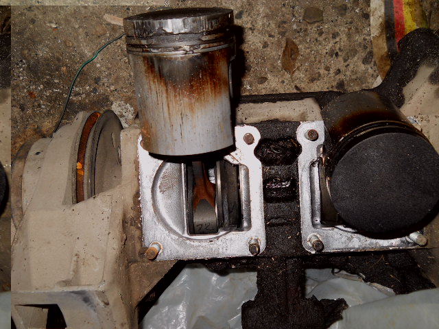 Колега,охлаби алтернатора от горния и долен болт,свали ремъка и завърти на ръка алтернатора и турбината след това-виж шума да не е от тях!След това можеш да отдалечиш ремъка от шайбата на кол.вал и да запалиш за кратко,ако шума го има има няколко варианта-счупени сигменти,счупено бутало на нивото на сигментите,разпаднало се лагерче на биелата горе при пистолния болт,или най-лошия вариант-разбит лагер долу на биелата при лагеруването на кол.вал.Когато там се разбие и падне циментацията на лагера, обикновено започва да трака с честотата на оборотите на двигателя.Може да премериш компресията на цилиндрите-това може да ти подскаже за проблема с въпросния цил.,не трябва да е под 7 и еднаква на двата цилиндъра!Успех с откриването и отстраняването на проблема! Ето един пример на счупено бутало,дано при теб не е така: