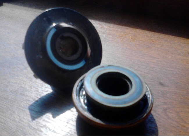 Още 200 километра пробег извън града, общо дотук 300 км. - не тече и уплътнява. Снимките на двата детайла се красноречиви за полировката, която се достига след 300 км пробег. Отново няма концентрични надрасквания, улейчета, пукнатини и пр. Очевидно и от снимките, там, където приляга и се трие железният пръстен, по лепиления пръстен остава по-тъмна на цвят и с метален блясък пътечка, което подсказва, че лепилото е достатъчно по-твърдо от графита и по твърдост е сравнимо с желязото, поради което има метални наслоявания върху лепилото, а не обратното. Дотук смятам опита за особено обнадеждаващ.